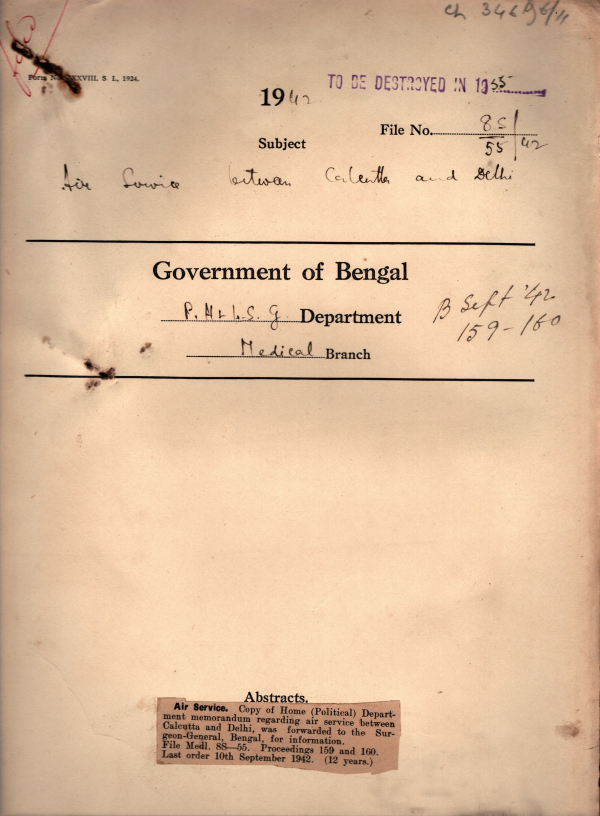 | Rack No. 09; Bundle No. 92 SL No. 7161 Permission to Santimoy Mukherjee, a student of National Medical Institute to appear at the Inter-mediate Licentiateship Exam Relaxation of rule 3. | Rack No. 09; Bundle No. 92 SL No. 7162 Rates of warm clothing admissible under rule 10 of the Darjeeling allowance code. | Rack No. 09; Bundle No. 92 SL No. 7163 Correspondence resting with your Memo. No. 841/M-1, dated the 27th April, 1942. | Rack No. 09; Bundle No. 92 SL No. 7164 Air Service between Calcutta and Delhi. | Rack No. 09; Bundle No. 92 SL No. 7165 Medical attendance on control Govt. officers and establishment in muffassal Appointment of fees between medical officers. | Rack No. 09; Bundle No. 92 SL No. 7166 Rule 49 of Civil Service Rule for removal or dismissal of Govt. Servants. | Rack No. 09; Bundle No. 92 SL No. 7167 Permission to Babu Biswa Ranjan Das, an evacuee medical student of Burma to appear at the Final L.M.F. Examination. |