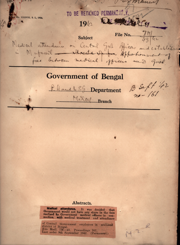 | Rack No. 09; Bundle No. 92 SL No. 7162 Rates of warm clothing admissible under rule 10 of the Darjeeling allowance code. | Rack No. 09; Bundle No. 92 SL No. 7163 Correspondence resting with your Memo. No. 841/M-1, dated the 27th April, 1942. | Rack No. 09; Bundle No. 92 SL No. 7164 Air Service between Calcutta and Delhi. | Rack No. 09; Bundle No. 92 SL No. 7165 Medical attendance on control Govt. officers and establishment in muffassal Appointment of fees between medical officers. | Rack No. 09; Bundle No. 92 SL No. 7166 Rule 49 of Civil Service Rule for removal or dismissal of Govt. Servants. | Rack No. 09; Bundle No. 92 SL No. 7167 Permission to Babu Biswa Ranjan Das, an evacuee medical student of Burma to appear at the Final L.M.F. Examination. | Rack No. 09; Bundle No. 92 SL No. 7168 Special Repairs to the underground filtered water reservoir in the compound of the Mental observation ward, Bhowanipore. |