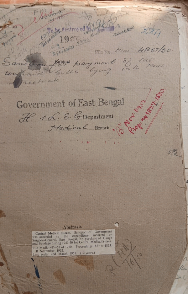 | Rack No. 10, Bundle No. 118 Sl No. 9749 Administrating of Sale tax and above the approval rate. | Rack No. 10, Bundle No. 118 Sl No. 9750 Maintenance and repairing to the T.B. Segregation Lt. of Feni and Brahmarbaria District of Tipperah. | Rack No. 10, Bundle No. 118 Sl No. 9751 Counting of Previous it continues service prion to 1.4.49 and benefit there of in term of govt. | Rack No. 10, Bundle No. 118 Sl No. 9752 Sanction for payment of the inhume bills paying with medical. | Rack No. 10, Bundle No. 118 Sl No. 9753 Improvement to the electrical installation of the Sadar + Sub-division (Hospital Rajbari + Faridpur plans + estimate of | Rack No. 10, Bundle No. 118 Sl No. 9754 Provision for additional compound light point for nurses' quarts at Mitford Hospital Dacca. | Rack No. 10, Bundle No. 118 Sl No. 9756 Sanction to the Purchase of certain furniture medical hospital Dacca. |