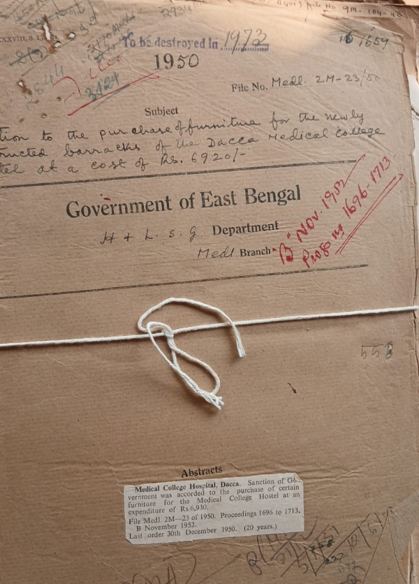 | Rack No. 10, Bundle No. 118 Sl No. 9752 Sanction for payment of the inhume bills paying with medical. | Rack No. 10, Bundle No. 118 Sl No. 9753 Improvement to the electrical installation of the Sadar + Sub-division (Hospital Rajbari + Faridpur plans + estimate of | Rack No. 10, Bundle No. 118 Sl No. 9754 Provision for additional compound light point for nurses' quarts at Mitford Hospital Dacca. | Rack No. 10, Bundle No. 118 Sl No. 9756 Sanction to the Purchase of certain furniture medical hospital Dacca. | Rack No. 10, Bundle No. 118 Sl No. 9756 Sanction of an extra allowance of Rs. 12/- P.M. to month A. Hossain 2nd clerk civil Surgeon office Kustia for doing double duties. | Rack No. 10, Bundle No. 118 Sl No. 9757 Payment of the bill of Rs. 176/5/6 of M (S.K.P. Shah + Sons Chemists + Bruges's of the supply of first Aid equipment at Manipur Dacca. | Rack No. 10, Bundle No. 118 Sl No. 9758 Pakistan practitioners of in digamous System of medicine Bill by Mr. Nur Ahmed. |