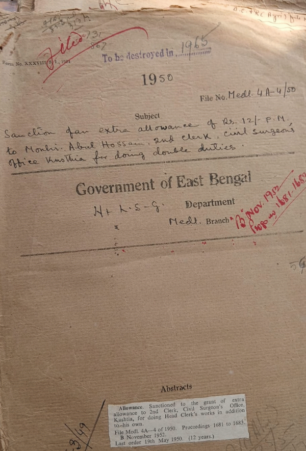 | Rack No. 10, Bundle No. 118 Sl No. 9753 Improvement to the electrical installation of the Sadar + Sub-division (Hospital Rajbari + Faridpur plans + estimate of | Rack No. 10, Bundle No. 118 Sl No. 9754 Provision for additional compound light point for nurses' quarts at Mitford Hospital Dacca. | Rack No. 10, Bundle No. 118 Sl No. 9756 Sanction to the Purchase of certain furniture medical hospital Dacca. | Rack No. 10, Bundle No. 118 Sl No. 9756 Sanction of an extra allowance of Rs. 12/- P.M. to month A. Hossain 2nd clerk civil Surgeon office Kustia for doing double duties. | Rack No. 10, Bundle No. 118 Sl No. 9757 Payment of the bill of Rs. 176/5/6 of M (S.K.P. Shah + Sons Chemists + Bruges's of the supply of first Aid equipment at Manipur Dacca. | Rack No. 10, Bundle No. 118 Sl No. 9758 Pakistan practitioners of in digamous System of medicine Bill by Mr. Nur Ahmed. | Rack No. 10, Bundle No. 118 Sl No. 9759 Appointment of Dr. Z.B. Kazi. |