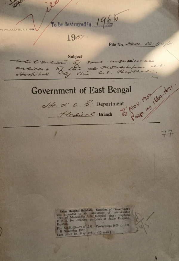 Utilization of unserviceable linen articles of the Mosheshpur A.S. Hospital by the C.S. Rajshahi.