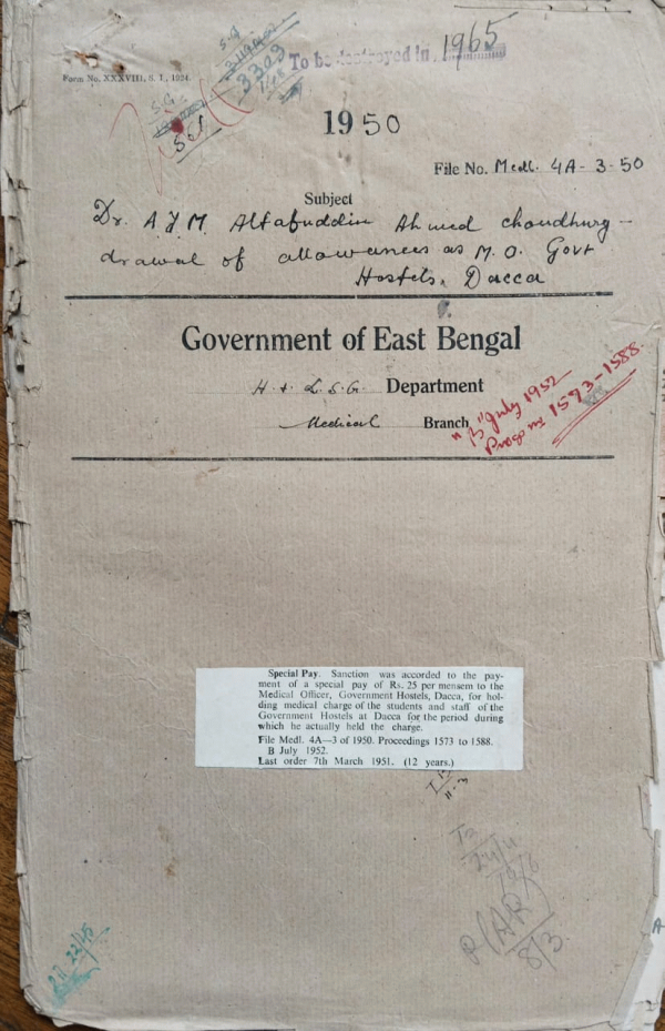 | Rack No. 10, Bundle No. 114, Sl No. 9419 Repair of the T.B. Segregation Hospital at Barisal. | Rack No. 10, Bundle No. 114, Sl No. 9420 Release of recovered criminal lunatic Erfanuddin. | Rack No. 10, Bundle No. 114, Sl No. 9421 Improvement of the Sadar and Sub-divisonal Hospital in the District of Barisal. | Rack No. 10, Bundle No. 114, Sl No. 9422 Dr. A.M. Aftabuddin Ahmed Choudhury drawal of allowances as M/O. govt. Hospital, Dacca. | Rack No. 10, Bundle No. 114, Sl No. 9423 Indian Service Postage Stamps overprinted with the ward "Pakistan" Stocks of information. | Rack No. 10, Bundle No. 114, Sl No. 9424 Appointment of Dr. Ahmed Mohiuddin as a professor of anatomy in the Dacca Medical College. | Rack No. 10, Bundle No. 114, Sl No. 9425 Improvement of the Sub-Divisional Hospital at Gaibandha, Rangpur. |