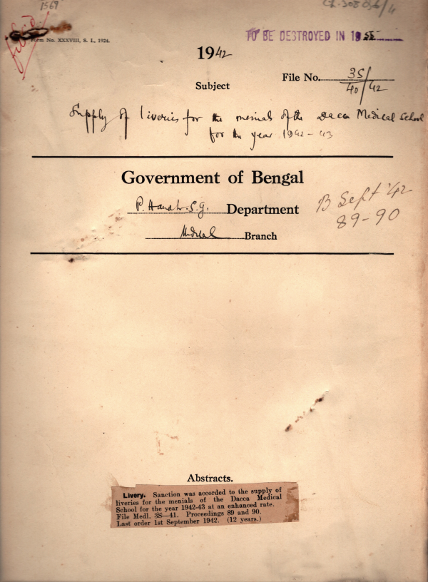 Supply of liveries for the menials of the Dacca Medical School for 1942-43.