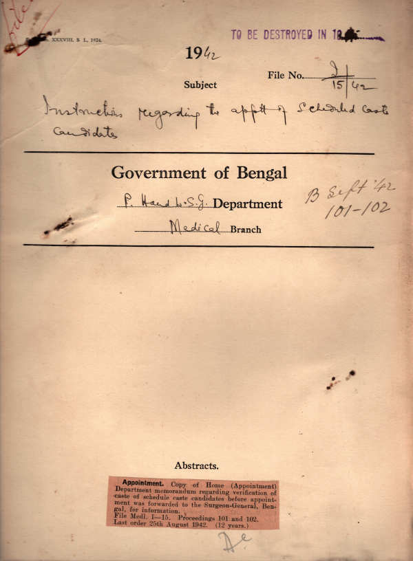 | Rack No. 09; Bundle No. 92 SL No. 7183 Supply of liveries for the menials of the Dacca Medical School for 1942-43. | Rack No. 09; Bundle No. 92 SL No. 7184 Delegation of power to the Dy. Magistrate Darjeeling under Section 3(6) of the Indian Lunacy Act. | Rack No. 09; Bundle No. 92 SL No. 7185 Petition from Basanti Sanyal a student of the Campbell Medical School, Calcutta for Scholarship. | Rack No. 09; Bundle No. 92 SL No. 7186 Instructions regarding the appointment of Schedule caste Candidates. | Rack No. 09; Bundle No. 92 SL No. 7187 Separation allowance to Govt. Servants Serving in non family areas. | Rack No. 09; Bundle No. 92 SL No. 7188 Superannuation pension of Dr. Jogesh Ch. Mukherjee, a retired Assistant Professor of Pathology, M.C. Calcutta. | Rack No. 09; Bundle No. 92 SL No. 7189 Superannuation pension of Dr. Charubrata Roy, a retired teacher of physiology, Campbell Medical School. |