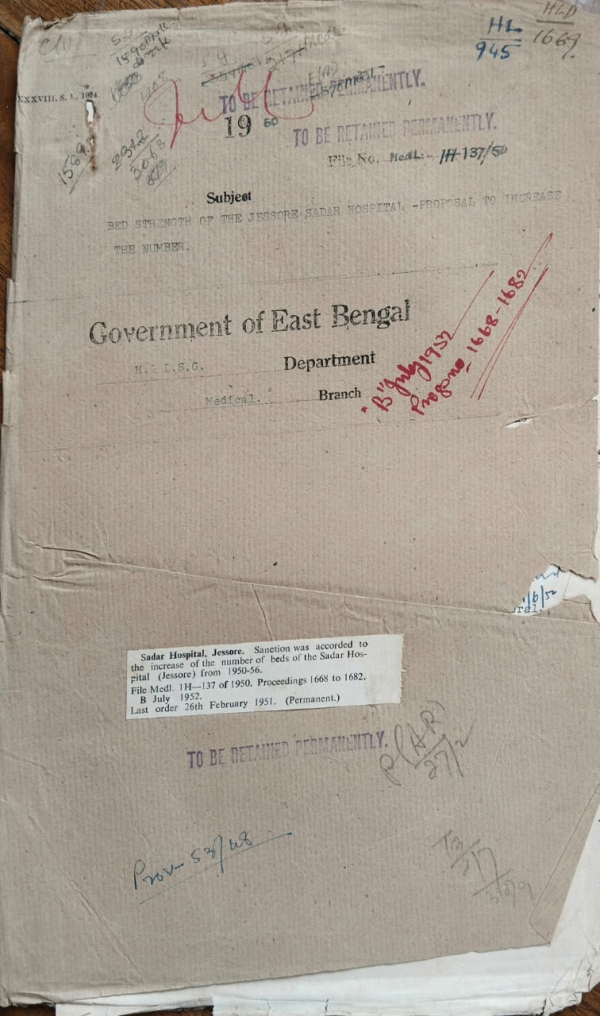 | Rack No. 10, Bundle No. 114, Sl No. 9436 Rowzan thana Hospital, Chittagong. | Rack No. 10, Bundle No. 114, Sl No. 9437 Arrear rent of the Damar Premises and Benglow. | Rack No. 10, Bundle No. 114, Sl No. 9438 H.B. Advance to Dr. W. Mahmood Deputy Surgeon general, East Bengal. | Rack No. 10, Bundle No. 114, Sl No. 9439 Bed strength of the Jessore Sadar Hospital Proposal increases the Member. | Rack No. 10, Bundle No. 114, Sl No. 9440 Telephone Bill of the C.S. Tippera Govt. Section. | Rack No. 10, Bundle No. 114, Sl No. 9441 Opening of an isolation hospital for treatment of the Small Pox Patients at Kushtia. | Rack No. 10, Bundle No. 114, Sl No. 9442 Retention of govt. out-door dispensary in the non-provincial districts. |