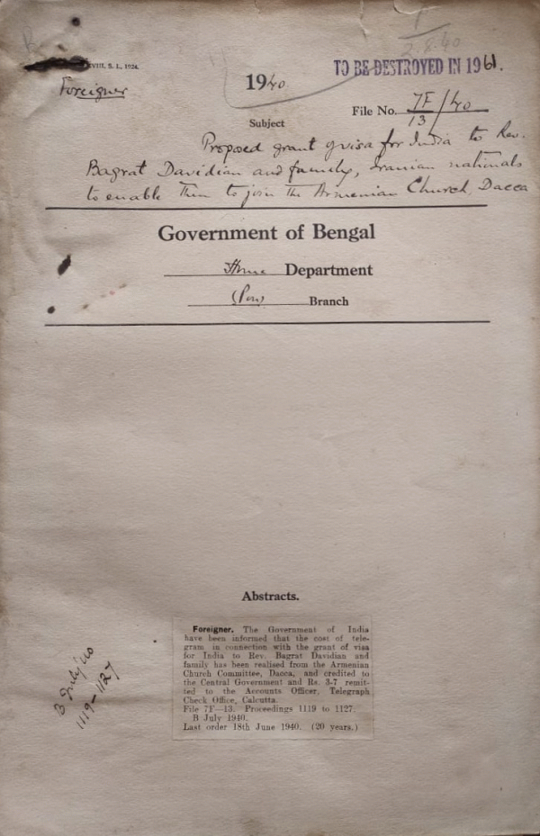 Grant of Visa for India to Rev. Bagrat Davidian & family, Irarian National to enable then to join the Armenian Church, Dacca.