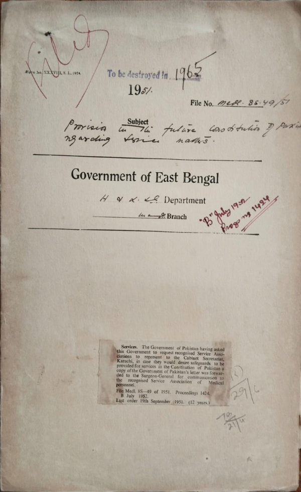 | Rack No. 10, Bundle No. 114, Sl No. 9453 Provincial of Health & Medical institution of Chittagong Dt. Bd. | Rack No. 10, Bundle No. 114, Sl No. 9454 Materials for Pakistan Today and Tomorrow "to be issued by the govt. of Pakistan on the next independence Day. | Rack No. 10, Bundle No. 114, Sl No. 9455 Sanction of an addll. Grants u/h T.A. and contract Contingencies subordinate to the head of the Medical. | Rack No. 10, Bundle No. 114, Sl No. 9456 Provision in the future constitutions of Pakistan regarding service matters. | Rack No. 10, Bundle No. 114, Sl No. 9457 Setting up a disposal Boards for the disposal of unserviceable articles of the T.B.S. Hospital in East Bengal. | Rack No. 10, Bundle No. 114, Sl No. 9458 Additional grants u/h Dacca Medical College "T.B.S wards" control & Prevention of V.D." Subordinate to "63-B Development Programme". | Rack No. 10, Bundle No. 114, Sl No. 9459 Introduction of double Shift System in Medical Colleges and Schools. |