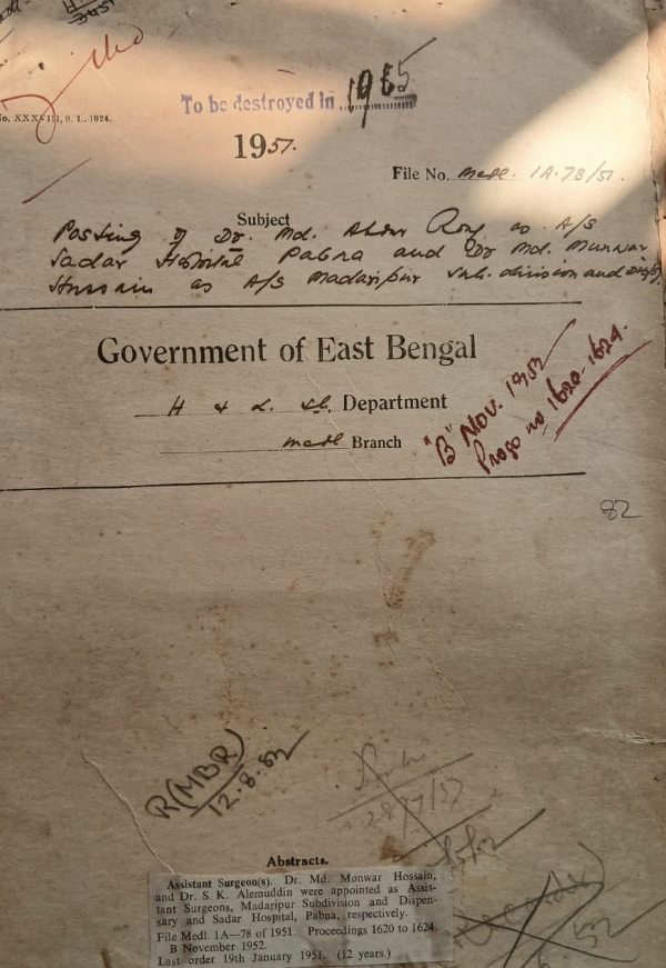 | Rack No. 10, Bundle No. 118 Sl No. 9779 Retention of the staff of the Dinajpur Ambulance Services for the year 1950-51 pay of | Rack No. 10, Bundle No. 118 Sl No. 9780 Counting of the Madras Govt. Service of Dr. A.H. Hydari to words in this increment. | Rack No. 10, Bundle No. 118 Sl No. 9781 Allegation against the Staff of the Sub-Divisional hospital Tanjail. | Rack No. 10, Bundle No. 118 Sl No. 9782 Posting of Dr. Md. A. Roud as A/S. Sadar Hospital Pabna and Dr. Monwan Hossain Sub-Divisional Dispensary. | Rack No. 10, Bundle No. 118 Sl No. 9783 Appointment of Dr. Syed A.A. Fazlur Rahim A/S. Kishnoreganj Sub-Divisional and dispensary district of Mymensingh. | Rack No. 10, Bundle No. 118 Sl No. 9784 Assembly Questions by Purnendu Kishore Sen Gupta. | Rack No. 10, Bundle No. 118 Sl No. 9785 Special pay of Md. Abdur Hossain, 2nd Clerk C.S. Officer Rajshahi. |