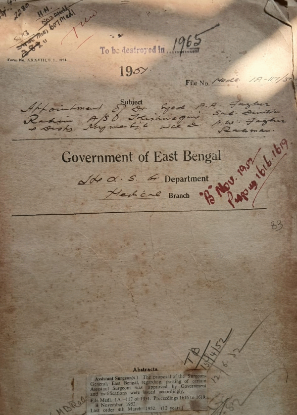 | Rack No. 10, Bundle No. 118 Sl No. 9780 Counting of the Madras Govt. Service of Dr. A.H. Hydari to words in this increment. | Rack No. 10, Bundle No. 118 Sl No. 9781 Allegation against the Staff of the Sub-Divisional hospital Tanjail. | Rack No. 10, Bundle No. 118 Sl No. 9782 Posting of Dr. Md. A. Roud as A/S. Sadar Hospital Pabna and Dr. Monwan Hossain Sub-Divisional Dispensary. | Rack No. 10, Bundle No. 118 Sl No. 9783 Appointment of Dr. Syed A.A. Fazlur Rahim A/S. Kishnoreganj Sub-Divisional and dispensary district of Mymensingh. | Rack No. 10, Bundle No. 118 Sl No. 9784 Assembly Questions by Purnendu Kishore Sen Gupta. | Rack No. 10, Bundle No. 118 Sl No. 9785 Special pay of Md. Abdur Hossain, 2nd Clerk C.S. Officer Rajshahi. | Rack No. 10, Bundle No. 118 Sl No. 9786 Disposal of Khaki Half-pants. |
