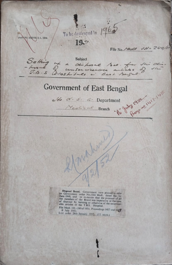 Setting up a disposal Boards for the disposal of unserviceable articles of the T.B.S. Hospital in East Bengal.
