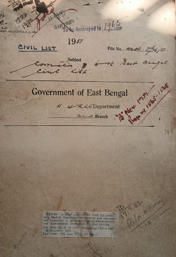 | Rack No. 10, Bundle No. 118 Sl No. 9788 Representation of Suresh Chandra Mali as Sweeper Cum done in this Noakhali Sadar Hospital. | Rack No. 10, Bundle No. 118 Sl No. 9789 Installation of telephone in the residence of the C/S. Rajshahi. | Rack No. 10, Bundle No. 118 Sl No. 9790 Regarding free supply of electricity to officer enjoying free quarters. | Rack No. 10, Bundle No. 118 Sl No. 9791 Correction to the E. Bengal Civil last corrected up to 1st April, 1950. | Rack No. 10, Bundle No. 118 Sl No. 9792 Budget estimate for the year 1950-51 and received budget estimate for the year 1949-50 under the head "38 Medical". | Rack No. 10, Bundle No. 118 Sl No. 9793 Reciprocal arrangement of registration of doctors between Punjab and East Bengal Medical Councils. | Rack No. 10, Bundle No. 118 Sl No. 9794 Study leave of Dr. Q. A. Khaleque on higher medical training abroad. |