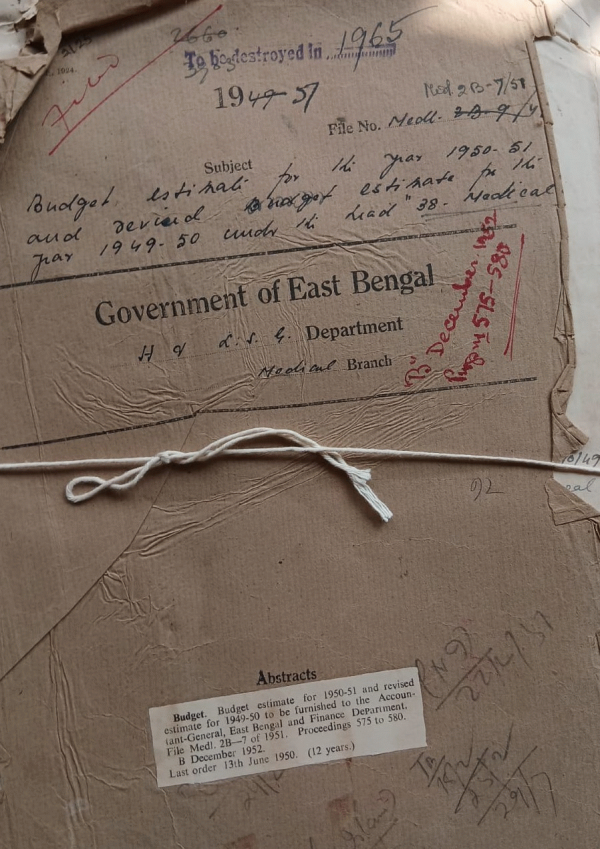 | Rack No. 10, Bundle No. 118 Sl No. 9789 Installation of telephone in the residence of the C/S. Rajshahi. | Rack No. 10, Bundle No. 118 Sl No. 9790 Regarding free supply of electricity to officer enjoying free quarters. | Rack No. 10, Bundle No. 118 Sl No. 9791 Correction to the E. Bengal Civil last corrected up to 1st April, 1950. | Rack No. 10, Bundle No. 118 Sl No. 9792 Budget estimate for the year 1950-51 and received budget estimate for the year 1949-50 under the head "38 Medical". | Rack No. 10, Bundle No. 118 Sl No. 9793 Reciprocal arrangement of registration of doctors between Punjab and East Bengal Medical Councils. | Rack No. 10, Bundle No. 118 Sl No. 9794 Study leave of Dr. Q. A. Khaleque on higher medical training abroad. | Rack No. 10, Bundle No. 118 Sl No. 9795 Section 80, P.P.C. the govt. pleader Chittagong. |