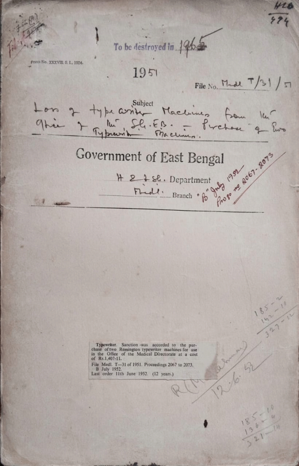 | Rack No. 10, Bundle No. 114, Sl No. 9457 Setting up a disposal Boards for the disposal of unserviceable articles of the T.B.S. Hospital in East Bengal. | Rack No. 10, Bundle No. 114, Sl No. 9458 Additional grants u/h Dacca Medical College "T.B.S wards" control & Prevention of V.D." Subordinate to "63-B Development Programme". | Rack No. 10, Bundle No. 114, Sl No. 9459 Introduction of double Shift System in Medical Colleges and Schools. | Rack No. 10, Bundle No. 114, Sl No. 9460 Loss of writer Machines from the office of the Surgeon general Eat Bengal. | Rack No. 10, Bundle No. 114, Sl No. 9461 Fixation of pay of the M.B. & M.M.F doctors who are working in the thana and rural Dispensaries in East Bengal. | Rack No. 10, Bundle No. 114, Sl No. 9462 Recruitment of Asstts. to the provincial govt. at the Headquarters of the Ministry of Foreign Affair and commonwealth Relation. | Rack No. 10, Bundle No. 114, Sl No. 9463 Counting of services of Dr. Nurunddin a S.A.S. towards his increments. |
