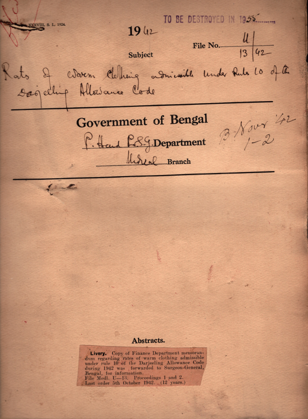 | Rack No. 09; Bundle No. 92 SL No. 7190 Dr. Clarice Grace Ruha was appointed as Honorary Lady doctor, Eden outpatient Department M.C. Hospital. | Rack No. 09; Bundle No. 93 SL No. 7191 Bengal Passage Rules. | Rack No. 09; Bundle No. 93 SL No. 7192 Grievances of the patients of European Ward in Medical College, Calcutta regarding supply of diets. | Rack No. 09; Bundle No. 93 SL No. 7193 Rates of warm Clothing admissible under Rules 10 of the Darjeeling Allowance Code. | Rack No. 09; Bundle No. 93 SL No. 7194 Birat U.B. Charitable Dispensary in the District of Rangpur. | Rack No. 09; Bundle No. 93 SL No. 7195 Bringing of Medical register of Provincial Medical Council of Medical Registration. | Rack No. 09; Bundle No. 93 SL No. 7196 P.F. alternative nominations. |