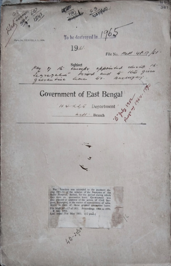 | Rack No. 10, Bundle No. 114, Sl No. 9462 Recruitment of Asstts. to the provincial govt. at the Headquarters of the Ministry of Foreign Affair and commonwealth Relation. | Rack No. 10, Bundle No. 114, Sl No. 9463 Counting of services of Dr. Nurunddin a S.A.S. towards his increments. | Rack No. 10, Bundle No. 114, Sl No. 9464 Additional grants u/h "T.A" & Contract contingencies" Subordinate to 38 Medical. | Rack No. 10, Bundle No. 114, Sl No. 9465 Pay of the wages of the Sweepers of Barisal Sadar Hospital. | Rack No. 10, Bundle No. 114, Sl No. 9466 Additional grant for meeting the cost of Stationary Centre Medical Stores. | Rack No. 10, Bundle No. 114, Sl No. 9467 Additional grant for contract contingences provincial, Kushtia Civil Surgeon. | Rack No. 10, Bundle No. 114, Sl No. 9468 Supplementary grants for the year 1950-51. |
