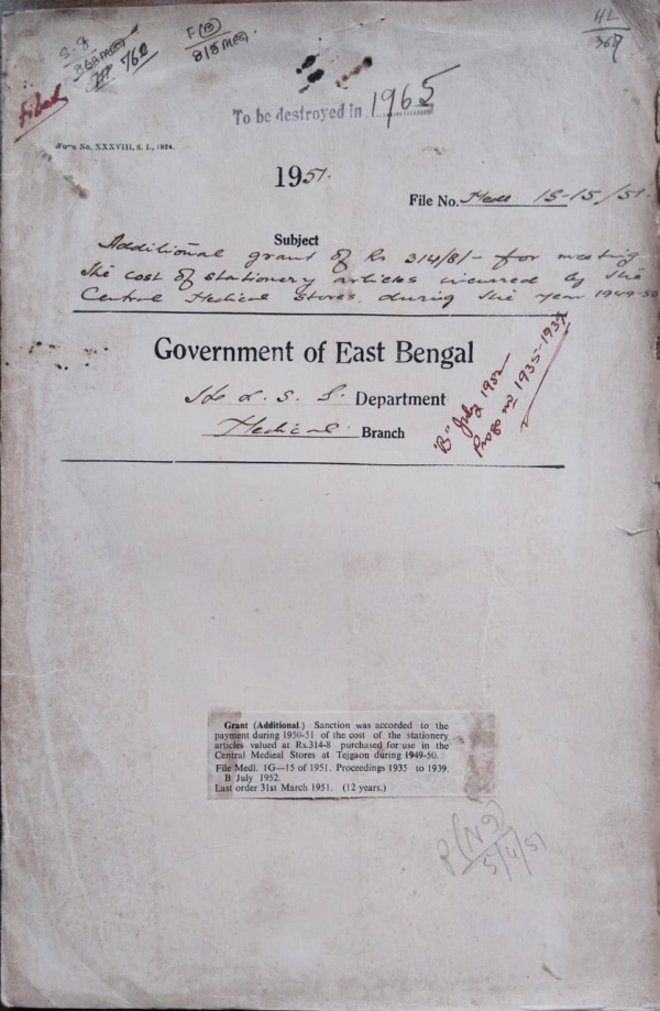 | Rack No. 10, Bundle No. 114, Sl No. 9463 Counting of services of Dr. Nurunddin a S.A.S. towards his increments. | Rack No. 10, Bundle No. 114, Sl No. 9464 Additional grants u/h "T.A" & Contract contingencies" Subordinate to 38 Medical. | Rack No. 10, Bundle No. 114, Sl No. 9465 Pay of the wages of the Sweepers of Barisal Sadar Hospital. | Rack No. 10, Bundle No. 114, Sl No. 9466 Additional grant for meeting the cost of Stationary Centre Medical Stores. | Rack No. 10, Bundle No. 114, Sl No. 9467 Additional grant for contract contingences provincial, Kushtia Civil Surgeon. | Rack No. 10, Bundle No. 114, Sl No. 9468 Supplementary grants for the year 1950-51. | Rack No. 10, Bundle No. 114, Sl No. 9469 House rent to Dr. Sharafuddin Ahmed M/O. of the Gobra Dispensaries, Jessore. |