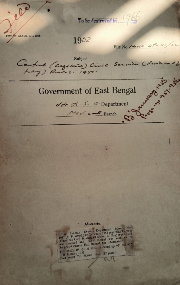 | Rack No. 10, Bundle No. 118 Sl No. 9798 Appointment of Dr. Anwar Hossain Azami as House. S. to the Prof. of Clinical Midwifery D.M.C. Hospital. | Rack No. 10, Bundle No. 118 Sl No. 9799 Installation 2 Pin-plug points in the pantry of the new Cabin of Medical College H. Dacca. | Rack No. 10, Bundle No. 118 Sl No. 9800 Installation of additional Electric light and Funs in the Sadar Hospital and attached buildings at Comilla. | Rack No. 10, Bundle No. 118 Sl No. 9801 Central C.S. (Revision of Pay) rules 1951. | Rack No. 10, Bundle No. 118 Sl No. 9802 Payment of advancement Changes of the Mitford Hospital Dacca. | Rack No. 10, Bundle No. 118 Sl No. 9803 Payment of the bill For receiving the stones the allowance A.S.H. of Surplus to Magura Jessore. | Rack No. 10, Bundle No. 118 Sl No. 9804 Repaints to Ambulance attaché to Sadar Hospital Bogra. |