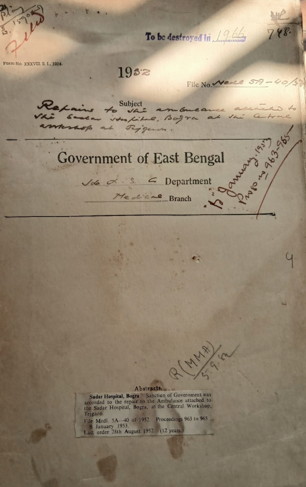 | Rack No. 10, Bundle No. 118 Sl No. 9801 Central C.S. (Revision of Pay) rules 1951. | Rack No. 10, Bundle No. 118 Sl No. 9802 Payment of advancement Changes of the Mitford Hospital Dacca. | Rack No. 10, Bundle No. 118 Sl No. 9803 Payment of the bill For receiving the stones the allowance A.S.H. of Surplus to Magura Jessore. | Rack No. 10, Bundle No. 118 Sl No. 9804 Repaints to Ambulance attaché to Sadar Hospital Bogra. | Rack No. 10, Bundle No. 118 Sl No. 9805 Retention of the temporary post of Hakim in Sylhet Tibbiyah College. | Rack No. 10, Bundle No. 118 Sl No. 9806 Realization of diet Charges from the Jail Rustiest while treatment in the Provincial and state hospital. | Rack No. 10, Bundle No. 118 Sl No. 9807 Retention of the host of part-time Anesthetist in the hospital Chittagong. |