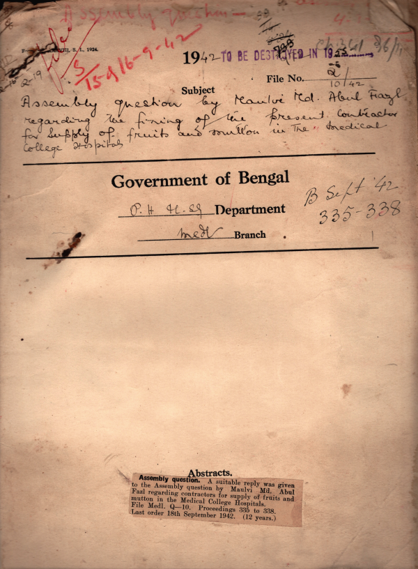 | Rack No. 09; Bundle No. 93 SL No. 7197 Chittagong general Hospital Appointments of members of the managing committee. | Rack No. 09; Bundle No. 93 SL No. 7198 Additional allowance to Dr. Haridas Gupta, S.A.S. Police Hospital, Bankura. | Rack No. 09; Bundle No. 93 SL No. 7199 Grant of Rs. 29,700/- for two years to the S.K. Hospital Mymensingh for efficient running of the Institution. | Rack No. 09; Bundle No. 93 SL No. 7200 A.Q. by Mvi. Md. Abul Fazl regarding the firing of the present contractor of Supply of fruits and mutton in the Medical. | Rack No. 09; Bundle No. 93 SL No. 7201 Increase of grant to the Chittagong general Hospital. | Rack No. 09; Bundle No. 93 SL No. 7202 Visiting Committee, Medical College Hospital. | Rack No. 09; Bundle No. 93 SL No. 7203 Appointment of Assistant Chemical Examiners. |