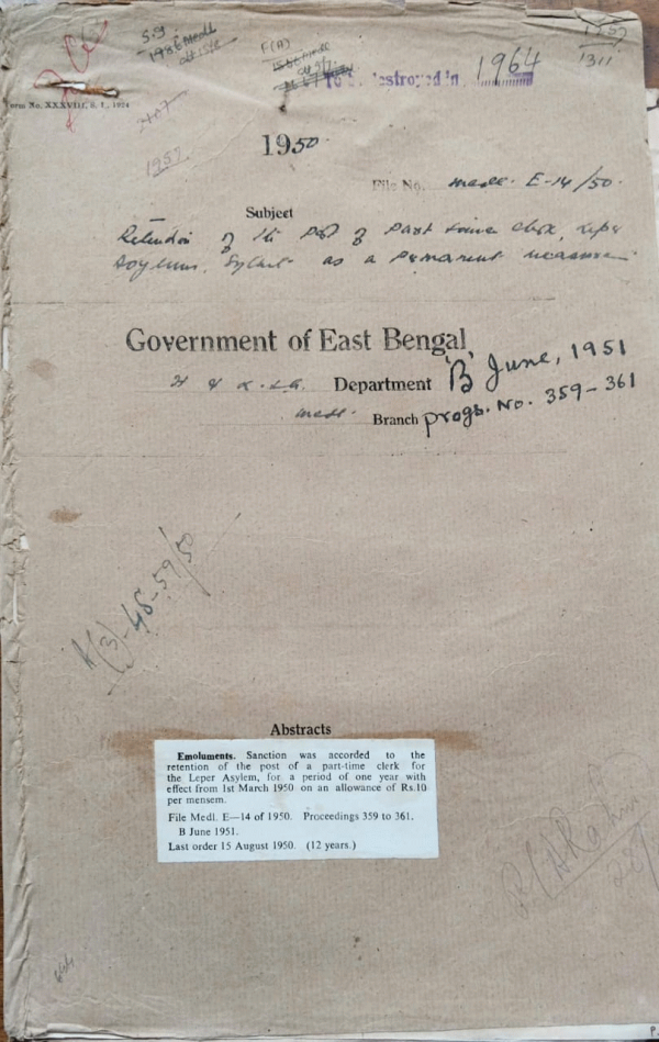 | Rack No. 10, Bundle No. 115, Sl No. 9472 Increment of pay of Dr. Basirullah teacher of medical Jurisprudence Chittagong Medical School. | Rack No. 10, Bundle No. 115, Sl No. 9473 Construction of medical officers quarters in the compound of the Sub-Division of the Sub-Divisional Hospital in Feni. | Rack No. 10, Bundle No. 115, Sl No. 9474 Retention of the V.D. Clinical at Dacca Chittagong to Council. | Rack No. 10, Bundle No. 115, Sl No. 9475 Retention of the post of a part time clerk a permanent measure. | Rack No. 10, Bundle No. 115, Sl No. 9476 Proposal for the grant of an advance of Rs. 175/- of Purchase of a Cycle of Mr. Arshadul Haque. | Rack No. 10, Bundle No. 115, Sl No. 9477 Sanction to the supply ginger and onion to the S.K. Hospital Mymensingh. | Rack No. 10, Bundle No. 115, Sl No. 9478 Formal dress to be worn on official function by Civil officers of the govt. of Pakistan. |