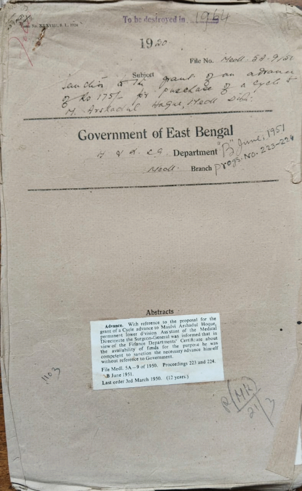 | Rack No. 10, Bundle No. 115, Sl No. 9473 Construction of medical officers quarters in the compound of the Sub-Division of the Sub-Divisional Hospital in Feni. | Rack No. 10, Bundle No. 115, Sl No. 9474 Retention of the V.D. Clinical at Dacca Chittagong to Council. | Rack No. 10, Bundle No. 115, Sl No. 9475 Retention of the post of a part time clerk a permanent measure. | Rack No. 10, Bundle No. 115, Sl No. 9476 Proposal for the grant of an advance of Rs. 175/- of Purchase of a Cycle of Mr. Arshadul Haque. | Rack No. 10, Bundle No. 115, Sl No. 9477 Sanction to the supply ginger and onion to the S.K. Hospital Mymensingh. | Rack No. 10, Bundle No. 115, Sl No. 9478 Formal dress to be worn on official function by Civil officers of the govt. of Pakistan. | Rack No. 10, Bundle No. 115, Sl No. 9479 Installation of Power Plug in the S.K. Hospital Mymensingh. |