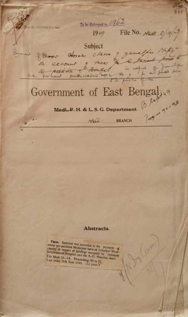 Arrear claims of the Jamalpur Municipality on account of Taxes for the periods prior to the partition of Bengal.