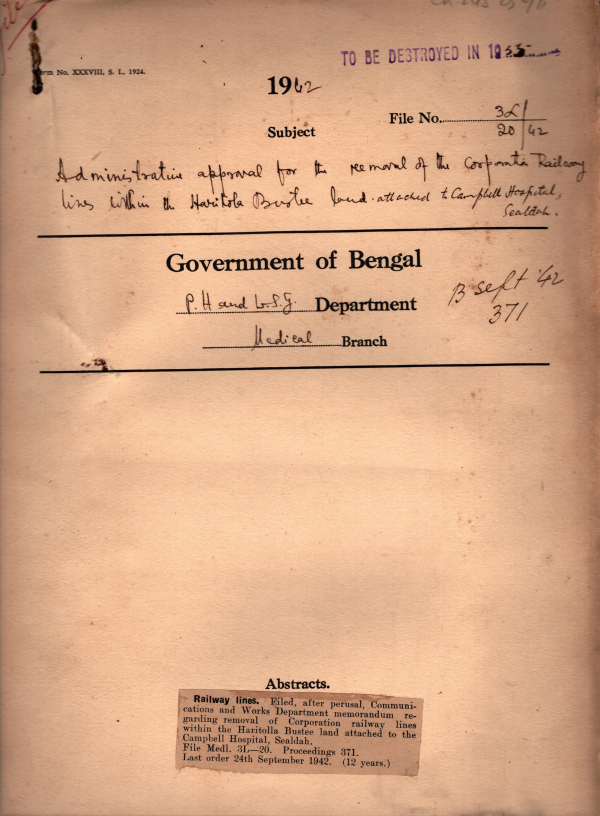 Administration approval for the removal of the corporation Railway lines within the Haritolla Bustee land attached to Campbeel Hospital, Sealdah.