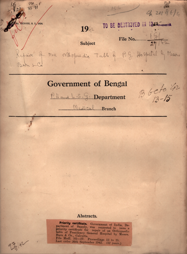 | Rack No. 09; Bundle No. 93 SL No. 7212 Instruction regarding the change of paper of various standard and non-standard forms. | Rack No. 09; Bundle No. 93 SL No. 7213 Grant to the B.C.M.R. for printing works done at the press. | Rack No. 09; Bundle No. 93 SL No. 7214 Case of Criminal lunatic Abdul Shaikh. | Rack No. 09; Bundle No. 93 SL No. 7215 Repair of one orthopedic table of P.G. Hospital by Messer. Calcutta. | Rack No. 09; Bundle No. 93 SL No. 7216 Arrangements for talking pictures of air raids. | Rack No. 09; Bundle No. 93 SL No. 7217 Defence of India Rules Correction Slips. | Rack No. 09; Bundle No. 93 SL No. 7218 Representation from Dr. O.G. Ohanian, D. Sc., D.C. Sc. Pres of I.F.S.R.S. for introducing his ancient tuberculosis patients in govt. Hospitals. |