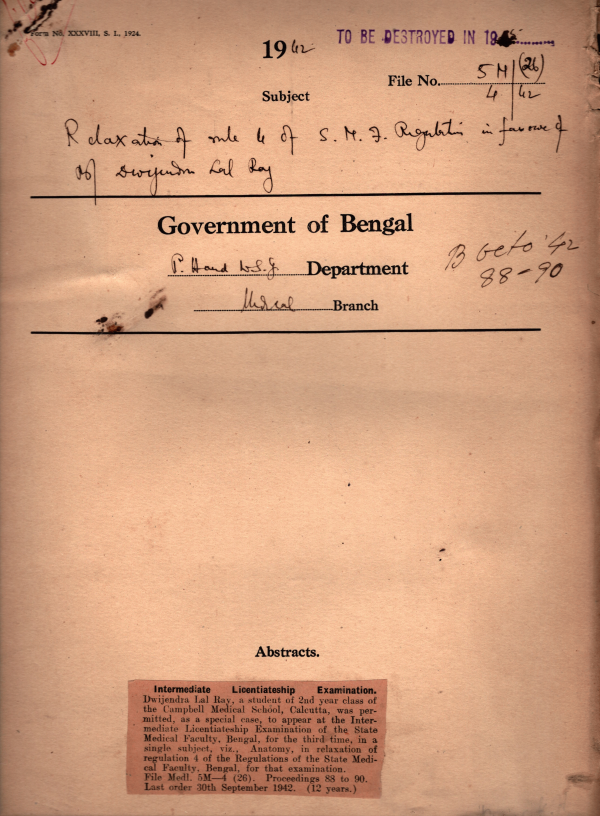 | Rack No. 09; Bundle No. 93 SL No. 7216 Arrangements for talking pictures of air raids. | Rack No. 09; Bundle No. 93 SL No. 7217 Defence of India Rules Correction Slips. | Rack No. 09; Bundle No. 93 SL No. 7218 Representation from Dr. O.G. Ohanian, D. Sc., D.C. Sc. Pres of I.F.S.R.S. for introducing his ancient tuberculosis patients in govt. Hospitals. | Rack No. 09; Bundle No. 93 SL No. 7219 Relaxation of rule 4 of S.M.F. Regulation in favor of Babu Dejendra Lal Roy. | Rack No. 09; Bundle No. 93 SL No. 7220 Petition from Ashalata Dass for Permission to appear at the Preliminary Nursing Examination. | Rack No. 09; Bundle No. 93 SL No. 7221 T.A. admissible to members of the election committee Medical College | Rack No. 09; Bundle No. 93 SL No. 7222 Descriptive Rolls etc. Lunatic Rampada Dolui Proposed for release. |
