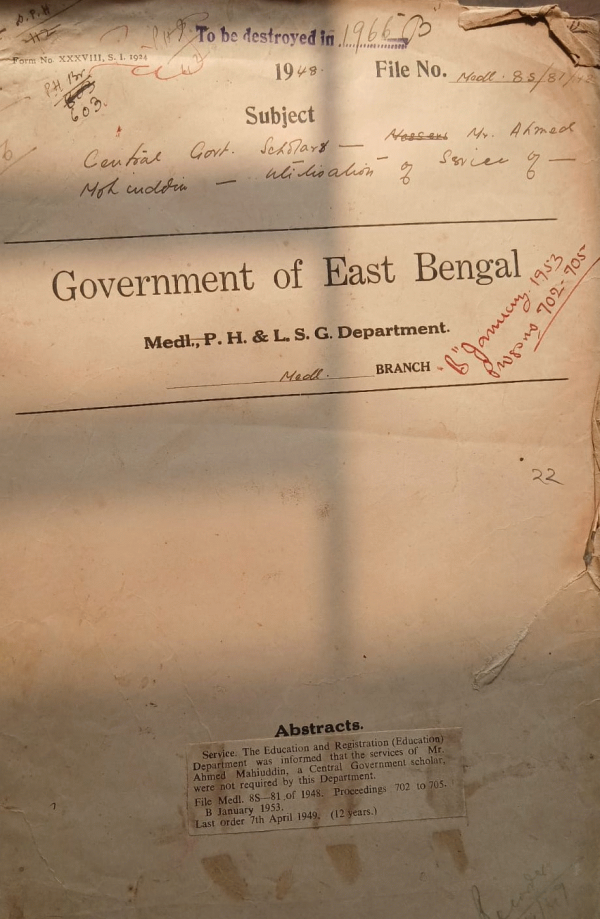 | Rack No. 10, Bundle No. 118 Sl No. 9819 Proposal for increasing a state of non-practicing allowance of the Support. Mitford Hospital Dacca. | Rack No. 10, Bundle No. 118 Sl No. 9820 Report on an impaction of the accounts of the A.G. Hospital Tippera for the Jean 1948-49. | Rack No. 10, Bundle No. 119 Sl No. 9821 Installation of a sanitary Latrine in the general ward and a sanitary Latrine + Septic Tank in the Isolation ward of the Sadar Hospital Jessore. | Rack No. 10, Bundle No. 119 Sl No. 9822 Central Govt. Scholar Mr. Ahmed Mohiuddin Utilization of Service of | Rack No. 10, Bundle No. 119 Sl No. 9823 Appointment of a peon on Rs. 25/- P.M. to the Office of the Superintendent Nursing Service, E.B. | Rack No. 10, Bundle No. 119 Sl No. 9824 Higher Medical training abroad Dr. Atabuddin Placement. | Rack No. 10, Bundle No. 119 Sl No. 9825 Recovery of the amount of money advance to Dr. Md. Mustafa, M/O. V.D. Clinic and Sri. G.K. Jarder Male nurse V.D. Clinic M.C.H. Calcutta. |
