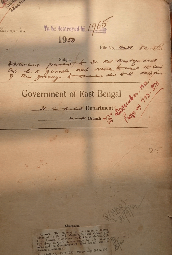 | Rack No. 10, Bundle No. 119 Sl No. 9822 Central Govt. Scholar Mr. Ahmed Mohiuddin Utilization of Service of | Rack No. 10, Bundle No. 119 Sl No. 9823 Appointment of a peon on Rs. 25/- P.M. to the Office of the Superintendent Nursing Service, E.B. | Rack No. 10, Bundle No. 119 Sl No. 9824 Higher Medical training abroad Dr. Atabuddin Placement. | Rack No. 10, Bundle No. 119 Sl No. 9825 Recovery of the amount of money advance to Dr. Md. Mustafa, M/O. V.D. Clinic and Sri. G.K. Jarder Male nurse V.D. Clinic M.C.H. Calcutta. | Rack No. 10, Bundle No. 119 Sl No. 9826 Creation of the post of Anesthetist + R/S. for Mitford Hospital, Dacca. | Rack No. 10, Bundle No. 119 Sl No. 9827 Appointment of members of the visiting committee of the Sadar + Sub-Divisional Hospital in the Rajshahi Division. | Rack No. 10, Bundle No. 119 Sl No. 9828 Visiting committee of the Sadar and Sub-Divisional Hospitals Rajshahi Division. |