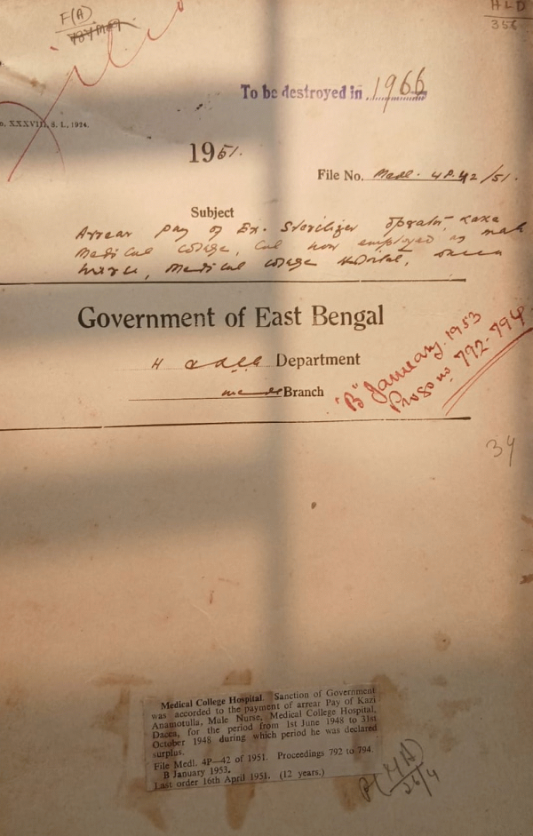 | Rack No. 10, Bundle No. 119 Sl No. 9831 Higher Medical Training Abroad Dr. Zahiruddin Ahmed. | Rack No. 10, Bundle No. 119 Sl No. 9832 Allotment of funds for distribution among the students of Medical Institution as Lume Stipends in the form of "Quarz-I-Hasnah" out of the "Quaid-I-Azam"s Relief Department. | Rack No. 10, Bundle No. 119 Sl No. 9833 Requirement of Spare parts for the Horizontal Sterilizes of the D.M.C.H. | Rack No. 10, Bundle No. 119 Sl No. 9834 Arrear pay of Ex-Sterilized operator, Lake Medical College Calcutta Now employed as male nurse, D.M.C.H. | Rack No. 10, Bundle No. 119 Sl No. 9835 Payment to the advertisement bill in connection with the admission of students into the Chittagong Medical School. | Rack No. 10, Bundle No. 119 Sl No. 9836 Creation of a post of night guard for the C.S.'s office, Noakhali. | Rack No. 10, Bundle No. 119 Sl No. 9837 Proposal for opening of a 4 bedded maternity ward attached to the Manikganj Prov. Hospital, Dacca. |