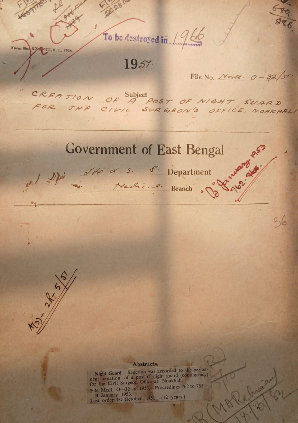 | Rack No. 10, Bundle No. 119 Sl No. 9833 Requirement of Spare parts for the Horizontal Sterilizes of the D.M.C.H. | Rack No. 10, Bundle No. 119 Sl No. 9834 Arrear pay of Ex-Sterilized operator, Lake Medical College Calcutta Now employed as male nurse, D.M.C.H. | Rack No. 10, Bundle No. 119 Sl No. 9835 Payment to the advertisement bill in connection with the admission of students into the Chittagong Medical School. | Rack No. 10, Bundle No. 119 Sl No. 9836 Creation of a post of night guard for the C.S.'s office, Noakhali. | Rack No. 10, Bundle No. 119 Sl No. 9837 Proposal for opening of a 4 bedded maternity ward attached to the Manikganj Prov. Hospital, Dacca. | Rack No. 10, Bundle No. 119 Sl No. 9838 Reservation of 6 beds for the treatment of the Ex-Servicemen T.B. Patients. | Rack No. 10, Bundle No. 119 Sl No. 9839 Creation of a temporary Post of a night guard for the Sadar Hospital, Noakhali. |