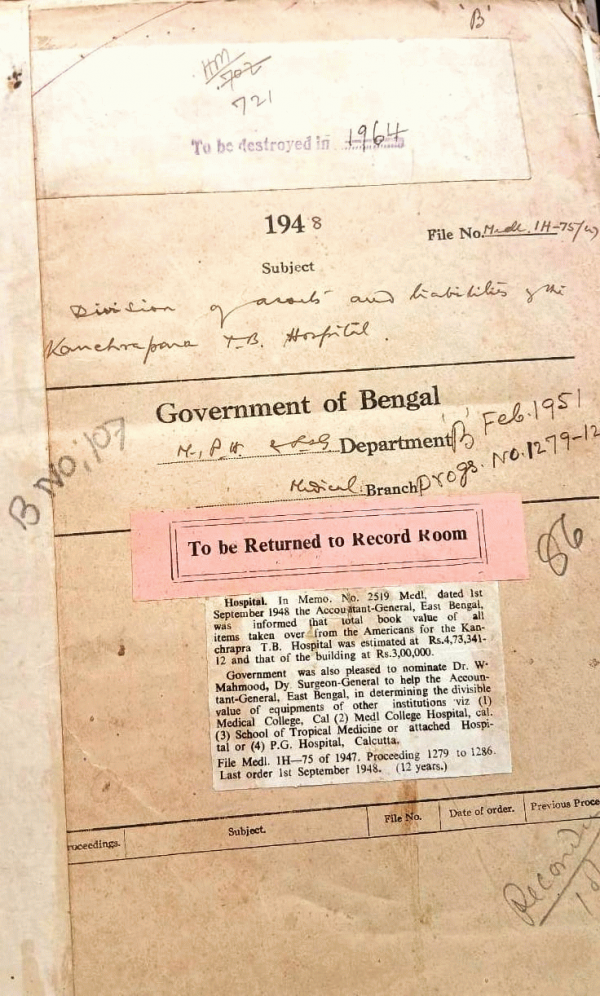 | Rack No. 09, Bundle No. 107, Sl No. 8758 Mitford Hospital Providing strong wire metting with frame in the verandah opening f the First floor of staff superintend Quitters (Knows European Ward). | Rack No. 09, Bundle No. 107, Sl No. 8759 Extra grant of Special pay of M.Q. Afzarl Ahmed Head Clerk D.M.S. for doing the dufies of cashier in additional to his own. | Rack No. 09, Bundle No. 107, Sl No. 8760 Questions whet on the proceedings of the medical board should be intimated to the candidates. | Rack No. 09, Bundle No. 107, Sl No. 8761 Theft in the ratandi Govt. out down Display. | Rack No. 09, Bundle No. 107, Sl No. 8762 Appointment of whole time principals of medical college. | Rack No. 09, Bundle No. 107, Sl No. 8763 Provincial of public health and medical service of the board. | Rack No. 09, Bundle No. 107, Sl No. 8764 Payment of Rs. 17/4/- to the compound quarters of Growing ghat thana dispensary district of Sylhet. |