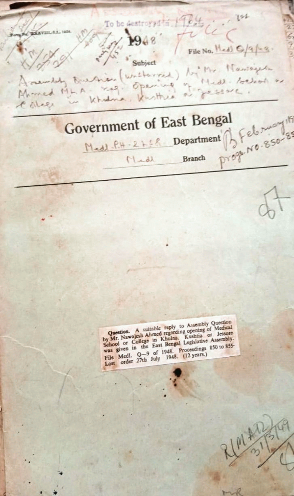 | Rack No. 09, Bundle No. 107, Sl No. 8759 Extra grant of Special pay of M.Q. Afzarl Ahmed Head Clerk D.M.S. for doing the dufies of cashier in additional to his own. | Rack No. 09, Bundle No. 107, Sl No. 8760 Questions whet on the proceedings of the medical board should be intimated to the candidates. | Rack No. 09, Bundle No. 107, Sl No. 8761 Theft in the ratandi Govt. out down Display. | Rack No. 09, Bundle No. 107, Sl No. 8762 Appointment of whole time principals of medical college. | Rack No. 09, Bundle No. 107, Sl No. 8763 Provincial of public health and medical service of the board. | Rack No. 09, Bundle No. 107, Sl No. 8764 Payment of Rs. 17/4/- to the compound quarters of Growing ghat thana dispensary district of Sylhet. | Rack No. 09, Bundle No. 107, Sl No. 8765 Appointment of Dr. N.I. Chowdhury as A.S. Sunamgong district of Sylthet. |