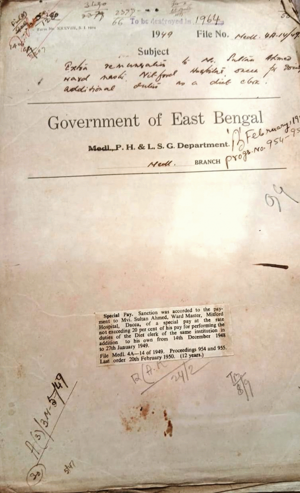| Rack No. 09, Bundle No. 107, Sl No. 8766 Formation of disposal Board for the Disposal of unserviceable articles of the D.R.S. in this Province. | Rack No. 09, Bundle No. 107, Sl No. 8767 Sanction of a Coolie for the Dacca medical college stone. | Rack No. 09, Bundle No. 107, Sl No. 8768 Sanction to the T.A. bill Rs. 168/6 of Mr. S.C. Gupta M.L.A. for attending of meeting of section D.M.C. for the year 1949-50. | Rack No. 09, Bundle No. 107, Sl No. 8769 Exemption from payment of Penalty of Rs. 1000/- and re-employment Dr. T.L.M.N. Chowdhury S.A.S. Representation from. | Rack No. 09, Bundle No. 107, Sl No. 8770 Appointment of part time post of medical officer for the M.S. of the hostel attached to the Jessore and Khulna Zilla School (information in connection with). | Rack No. 09, Bundle No. 107, Sl No. 8771 Sister Gone Apexes Application for appoint as nurse | Rack No. 09, Bundle No. 107, Sl No. 8772 Acceptance of the govt. servants proceeds by these public Duties. |