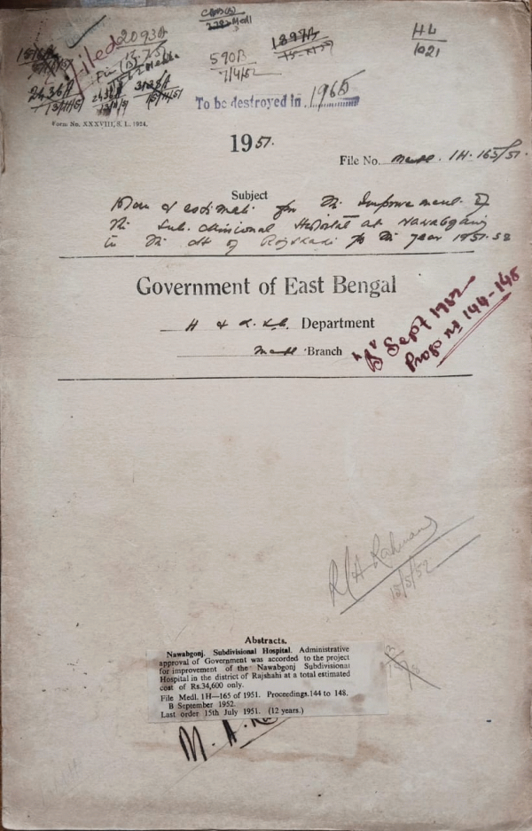 | Rack No. 10, Bundle No. 115, Sl No. 9492 Appointment of Dr. A. Sasit and A. Rahman as Clinical Pathologist Dacca medical college Hospital. | Rack No. 10, Bundle No. 115, Sl No. 9493 Non-payment of the Salaries of the Vaccinations absorbed govt. scheme Sylhet. | Rack No. 10, Bundle No. 115, Sl No. 9494 Grant to rural thana + Village dispensaries for the June 1947-48 Rajshahi divisions. | Rack No. 10, Bundle No. 115, Sl No. 9495 Construction of Sadar hospital at a new site Ragamati in Chittagong hill tracts. | Rack No. 10, Bundle No. 115, Sl No. 9496 Establishment of a dispensary at Pantashi in the District of Bakarganj. | Rack No. 10, Bundle No. 116 Sl No. 9541 Sanction to the purchase of furniture for the Bandarban Sub-Divisional Hospital and Dispensaries. | Rack No. 10, Bundle No. 116 Sl No. 9542 Use of service postage stamps on official's correspondence. |
