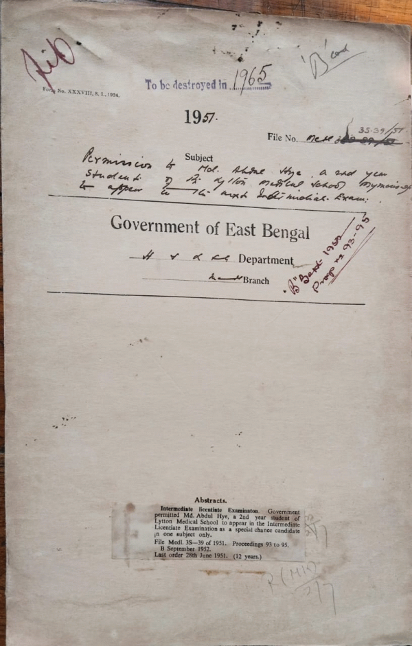 | Rack No.10, Bundle No. 115, Sl No. 9506 Improvement of drainage system in the Sadar Hospital Barisal. | Rack No.10, Bundle No. 115, Sl No. 9507 Improvement to Sub-divisional hospital at Nawabgonj during 1951-52 in the district of Rajshahi. | Rack No.10, Bundle No. 115, Sl No. 9508 Use of military mark and tittles by ex-military personnel re-employed in Civil Posts. | Rack No.10, Bundle No. 115, Sl No. 9509 Permission of Md. Abdulhye a 2nd year student of Lyton Medical School Mymensingh. | Rack No.10, Bundle No. 115, Sl No. 9510 Fixation of the date for this L.M.F. Examination by the State Medical faculty. | Rack No.10, Bundle No. 115, Sl No. 9511 Disposal of one baby. | Rack No.10, Bundle No. 115, Sl No. 9512 Fixation of the pay Scales of this compounder of this civil Hospital Sylhet. |