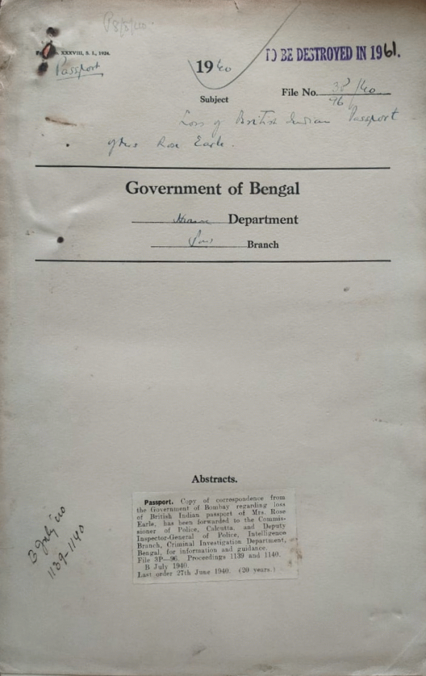 Loss of British Indian Passport of Mrs. Rose Earle.