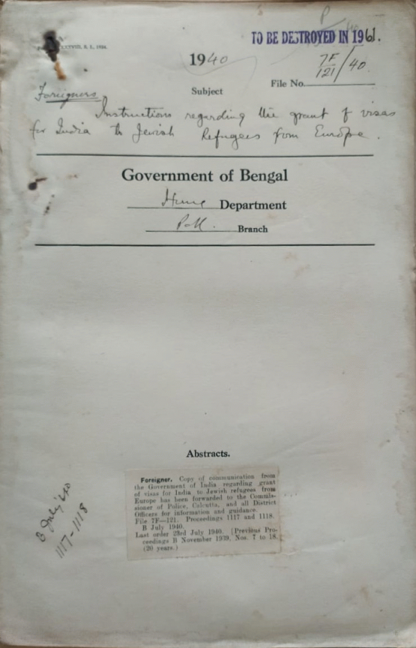Instruction regarding the grant of visas for India to Jewish Refugees from Europe.