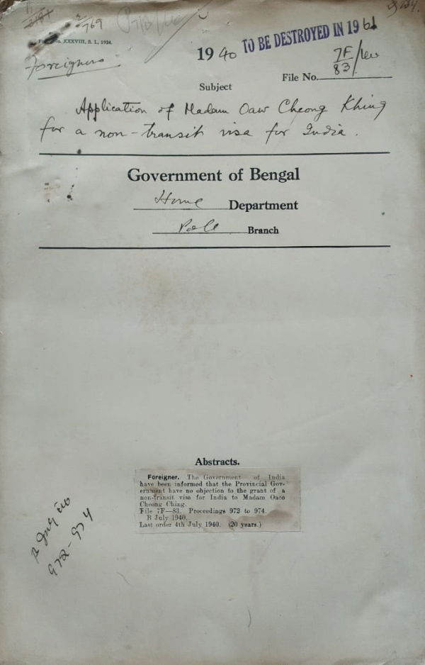 | Rack No. 42, Bundle No. 08, Sl No. 560 Instruction regarding the grant of visas for India to Jewish Refugees from Europe. | Rack No. 42, Bundle No. 08, Sl No. 561 Rules & regulation relating to Indian passport. | Rack No. 42, Bundle No. 08, Sl No. 562 Police Parade at Dacca, 1940. | Rack No. 42, Bundle No. 08, Sl No. 563 Grant of a non transit visa for India to madanoaco Chenong Chign. | Rack No. 42, Bundle No. 08, Sl No. 564 Impounding of passport of Mirza Ferozuddin Homic who had died at Abadan. | Rack No. 42, Bundle No. 08, Sl No. 565 Grant of facilities to Mr. Tiber Stary, an Austrian Jewish refugees to visit Ceylon | Rack No. 42, Bundle No. 08, Sl No. 566 Instruction with regard to Citizens of Eire who visit Enemy Territory. |