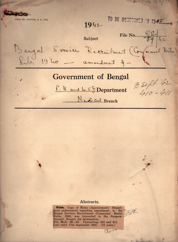 | Rack No. 09; Bundle No. 93 SL No. 7247 Retention of a temporary Clerk in P.G. Fund for the period of Emergency. | Rack No. 09; Bundle No. 93 SL No. 7248 Medical Council of India Election of members to Expenditure Budget Provision. | Rack No. 09; Bundle No. 93 SL No. 7249 Posting of Dr. Md. Golam Kibria to Jamalpur Sub-division and dispensary. | Rack No. 09; Bundle No. 93 SL No. 7250 Bengal Services Recruitment Rules 1910 amendment. | Rack No. 09; Bundle No. 93 SL No. 7251 Communal ratio statement of B.M.S. | Rack No. 09; Bundle No. 93 SL No. 7252 Case of Criminal lunatic Jogeswar Patni. | Rack No. 09; Bundle No. 93 SL No. 7253 Change of Jurisdiction |