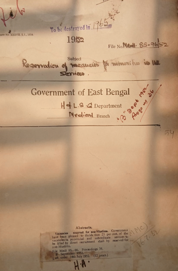| Rack No. 10, Bundle No. 119 Sl No. 9851 Extra remuneration of Rs. 30/- P.M. to the Head Clerk D.M.S. for doing double duties. | Rack No. 10, Bundle No. 119 Sl No. 9852 Instruction against direct corresponded with the U.N. Authorities in the matter of training, placement , etc. | Rack No. 10, Bundle No. 119 Sl No. 9853 Reception arrangements required for the Pakistan's Diplomatic Mission abroad. | Rack No. 10, Bundle No. 119 Sl No. 9854 Reservation of vacancies for minorities in the services. | Rack No. 10, Bundle No. 119 Sl No. 9855 Appt. of Dr. Syed Abdul Mannan, A/S. Sunamganj Hill Tracts Vice Dr. B. Ahmed. | Rack No. 10, Bundle No. 119 Sl No. 9856 Construction of a garage for the truck attached to the D.R.S., Comilla. | Rack No. 10, Bundle No. 119 Sl No. 9857 Resolution of the Committee of the Thakorgaon Prov. Hospital, Dinajpur. |
