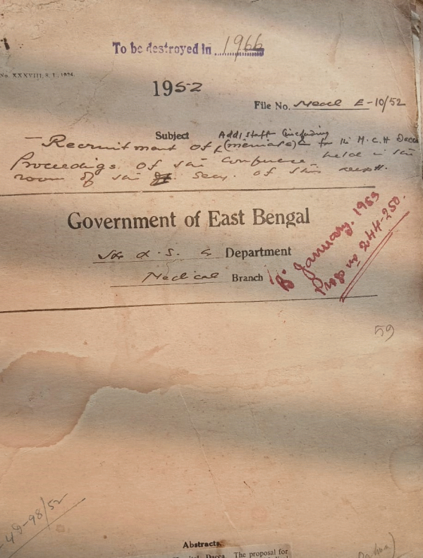 | Rack No. 10, Bundle No. 119 Sl No. 9856 Construction of a garage for the truck attached to the D.R.S., Comilla. | Rack No. 10, Bundle No. 119 Sl No. 9857 Resolution of the Committee of the Thakorgaon Prov. Hospital, Dinajpur. | Rack No. 10, Bundle No. 119 Sl No. 9858 T.A. bills of doctors compounders and nurses of the Mitford Hospital, Dacca who were deputed of Faridpur for rendering Medical aid to the Tornado affected people. | Rack No. 10, Bundle No. 119 Sl No. 9859 Recruitment of additional staff for the M.C.H. Dacca Proceedings of the Conference held in the room of the Secretary of the Department. | Rack No. 10, Bundle No. 119 Sl No. 9860 Utilization of services of Junior Doctors in the out-patients department of D.M.C.H. | Rack No. 10, Bundle No. 119 Sl No. 9861 Construction of 4 Nurses quarters in the compound of Sub-Division Hospital, Brahmanbaria, Tippera. | Rack No. 10, Bundle No. 119 Sl No. 9862 Fitting up a tank within the compound of the Sub-divisional Hospital, Brahmanbaria. |