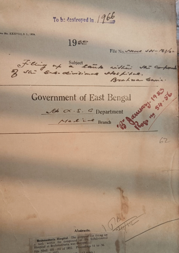 | Rack No. 10, Bundle No. 119 Sl No. 9859 Recruitment of additional staff for the M.C.H. Dacca Proceedings of the Conference held in the room of the Secretary of the Department. | Rack No. 10, Bundle No. 119 Sl No. 9860 Utilization of services of Junior Doctors in the out-patients department of D.M.C.H. | Rack No. 10, Bundle No. 119 Sl No. 9861 Construction of 4 Nurses quarters in the compound of Sub-Division Hospital, Brahmanbaria, Tippera. | Rack No. 10, Bundle No. 119 Sl No. 9862 Fitting up a tank within the compound of the Sub-divisional Hospital, Brahmanbaria. | Rack No. 10, Bundle No. 119 Sl No. 9863 Sanction of house building advance procedure for | Rack No. 10, Bundle No. 119 Sl No. 9864 Sanction of house rent allowance to the M.O. of Bajitpur Thana Dispensary, Mymensingh. | Rack No. 10, Bundle No. 119 Sl No. 9865 House Building advance to M.A. Waris, U.D.A. Assistant office of the Assistant Controller of stamps, Dacca. |