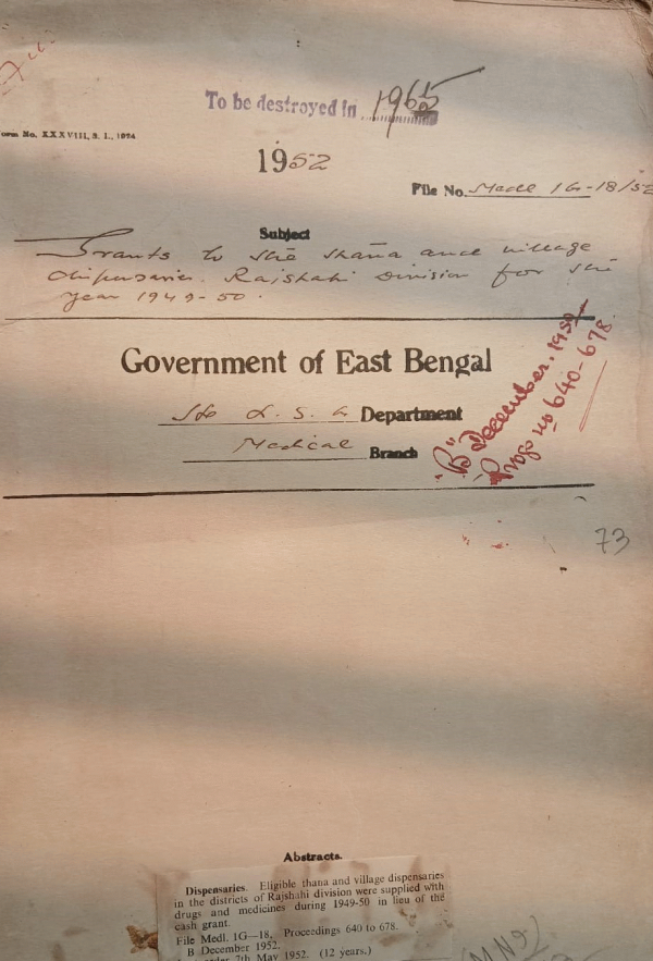 | Rack No. 10, Bundle No. 119 Sl No. 9870 Concession admissible to demobilized Medical Licentiate undergoing M.B.B.S. Course Case of Dr. Md. Saifullah (A/S on leave). | Rack No. 10, Bundle No. 119 Sl No. 9871 Condensed M.B. Course in the D.M.C. admission of students of | Rack No. 10, Bundle No. 119 Sl No. 9872 U.N. questionnaires on blind and partially sighted Children. | Rack No. 10, Bundle No. 119 Sl No. 9873 Grant to the Thana & Village Dispensaries Rajshahi Division for 1949-50. | Rack No. 10, Bundle No. 119 Sl No. 9874 Determination of pay on promotion made since 14th August 1947. | Rack No. 10, Bundle No. 119 Sl No. 9875 Booklet entitled "Pakistan O Bharater Madhey Jatayater Passport O Visar Niyamabali." | Rack No. 10, Bundle No. 119 Sl No. 9876 Rules for the Regulation of Recruitment to the Clerical Service of the Secretariat and Certain other officer. |
