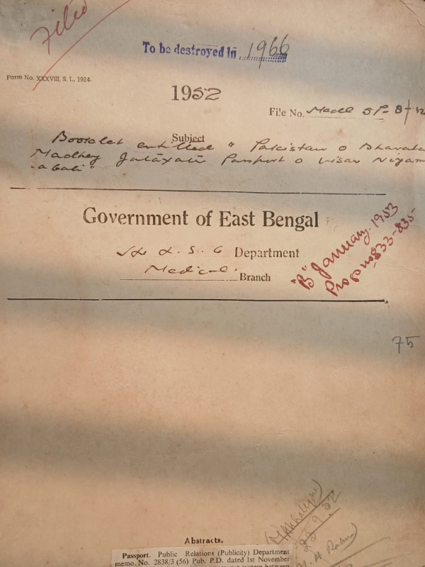 | Rack No. 10, Bundle No. 119 Sl No. 9872 U.N. questionnaires on blind and partially sighted Children. | Rack No. 10, Bundle No. 119 Sl No. 9873 Grant to the Thana & Village Dispensaries Rajshahi Division for 1949-50. | Rack No. 10, Bundle No. 119 Sl No. 9874 Determination of pay on promotion made since 14th August 1947. | Rack No. 10, Bundle No. 119 Sl No. 9875 Booklet entitled "Pakistan O Bharater Madhey Jatayater Passport O Visar Niyamabali." | Rack No. 10, Bundle No. 119 Sl No. 9876 Rules for the Regulation of Recruitment to the Clerical Service of the Secretariat and Certain other officer. | Rack No. 10, Bundle No. 119 Sl No. 9877 A.Q. by Mrs. Anwara Khatun, M.L.A. regarding common room for the female medical students in D.M.C. | Rack No. 10, Bundle No. 119 Sl No. 9878 Nursing staff etc. Uniformity in scales of pay of |
