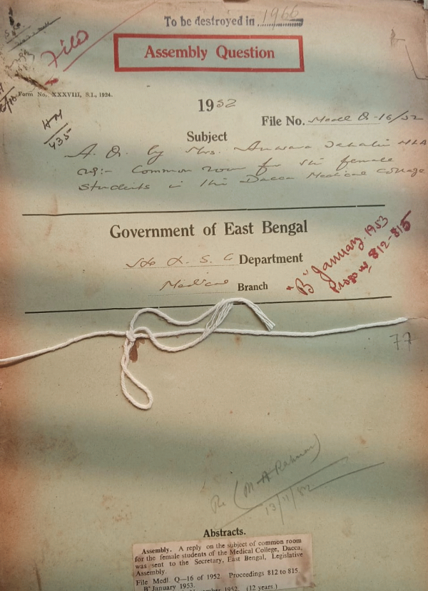 | Rack No. 10, Bundle No. 119 Sl No. 9874 Determination of pay on promotion made since 14th August 1947. | Rack No. 10, Bundle No. 119 Sl No. 9875 Booklet entitled "Pakistan O Bharater Madhey Jatayater Passport O Visar Niyamabali." | Rack No. 10, Bundle No. 119 Sl No. 9876 Rules for the Regulation of Recruitment to the Clerical Service of the Secretariat and Certain other officer. | Rack No. 10, Bundle No. 119 Sl No. 9877 A.Q. by Mrs. Anwara Khatun, M.L.A. regarding common room for the female medical students in D.M.C. | Rack No. 10, Bundle No. 119 Sl No. 9878 Nursing staff etc. Uniformity in scales of pay of | Rack No. 10, Bundle No. 119 Sl No. 9879 Proposal for creation of "Night Guard" for the office of the D.H.O. of the Prov. District". | Rack No. 10, Bundle No. 119 Sl No. 9880 Appointment of Dr. Sabahuddin Ahmed for the Post of an A/S. in the E.P.M.S. (Upper). |