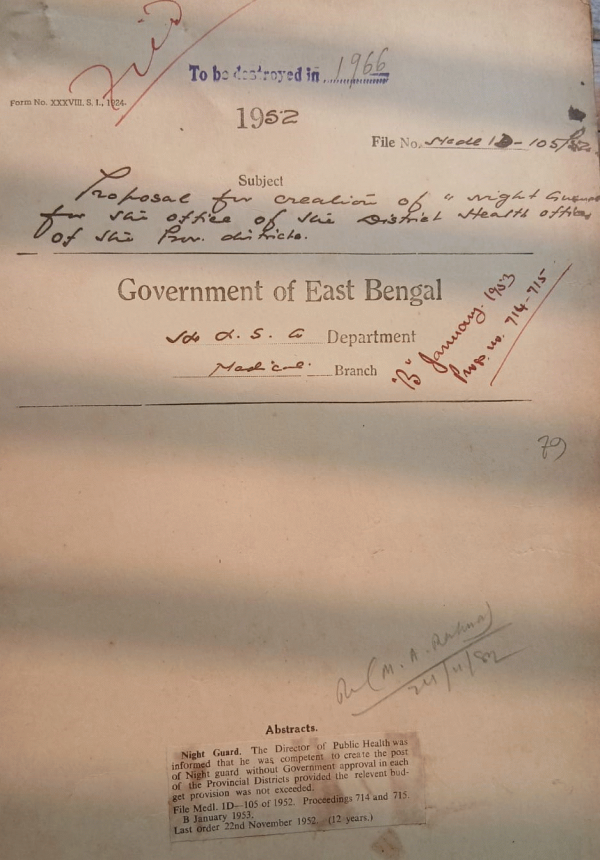| Rack No. 10, Bundle No. 119 Sl No. 9876 Rules for the Regulation of Recruitment to the Clerical Service of the Secretariat and Certain other officer. | Rack No. 10, Bundle No. 119 Sl No. 9877 A.Q. by Mrs. Anwara Khatun, M.L.A. regarding common room for the female medical students in D.M.C. | Rack No. 10, Bundle No. 119 Sl No. 9878 Nursing staff etc. Uniformity in scales of pay of | Rack No. 10, Bundle No. 119 Sl No. 9879 Proposal for creation of "Night Guard" for the office of the D.H.O. of the Prov. District". | Rack No. 10, Bundle No. 119 Sl No. 9880 Appointment of Dr. Sabahuddin Ahmed for the Post of an A/S. in the E.P.M.S. (Upper). | Rack No. 10, Bundle No. 119 Sl No. 9881 Sanction of a post of Night Guard cum Darwan for guarding the newly constructed C/S's office, Jessore. | Rack No. 10, Bundle No. 119 Sl No. 9882 Grant for the purchase of doors and almirahs for the newly started library for the patients of D.M.C.H. |